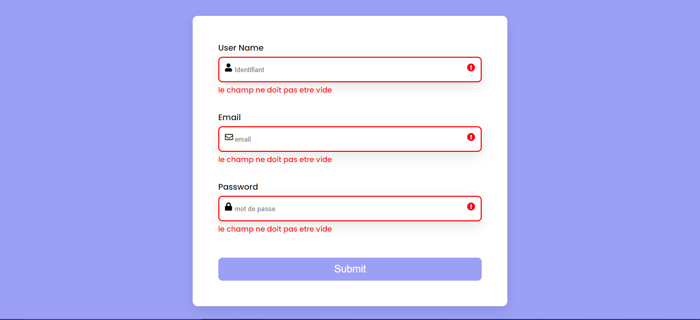invalForm(email, 1, "le champ ne doit pas etre vide");